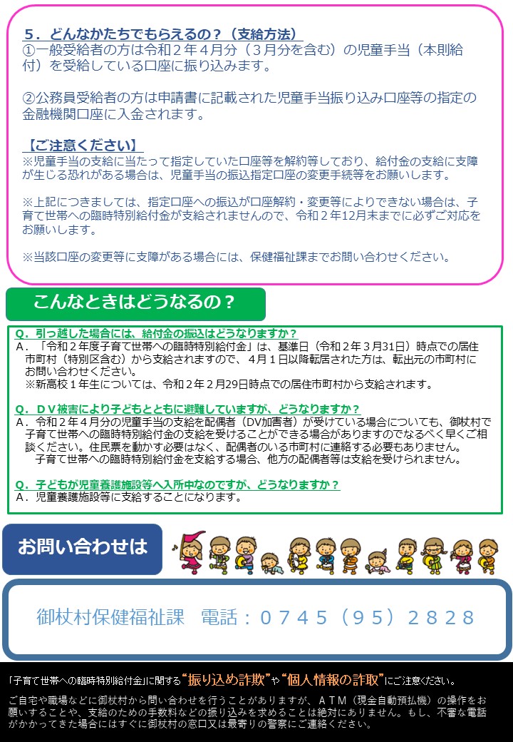 子育て世帯への臨時特別給付金について 更新日:2020年05月29日 この記事に関するお問い合わせ先 保健福祉課〒633-1302 奈良県宇陀郡御杖村大字菅野1581番地保健福祉医療総合センター内電話番号:0745-95-2828(内線:600、610~615)ファックス:0745-95-6011メールフォームからお問合せする